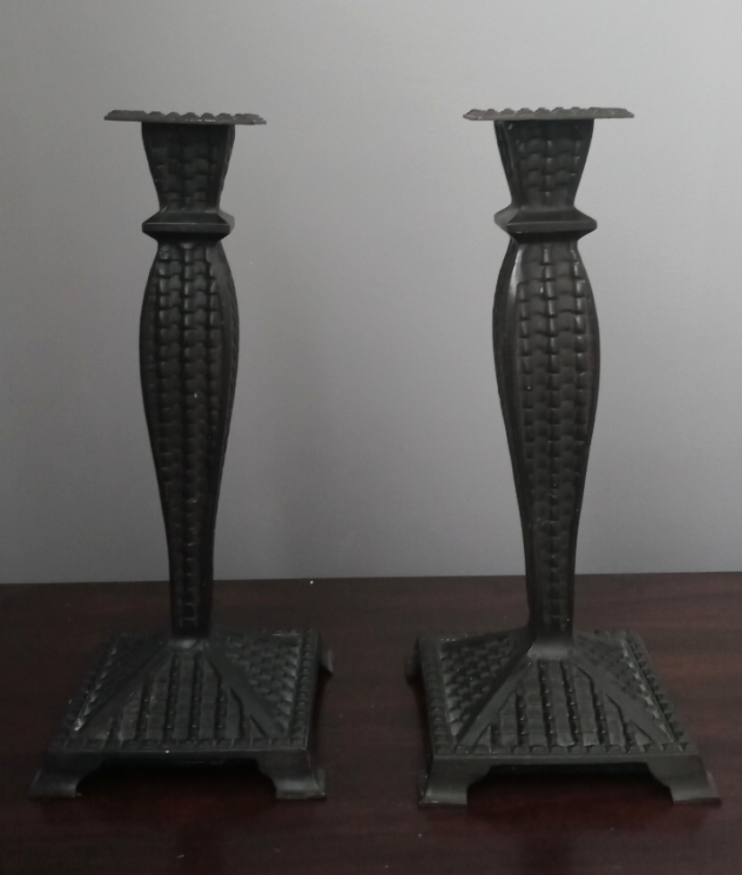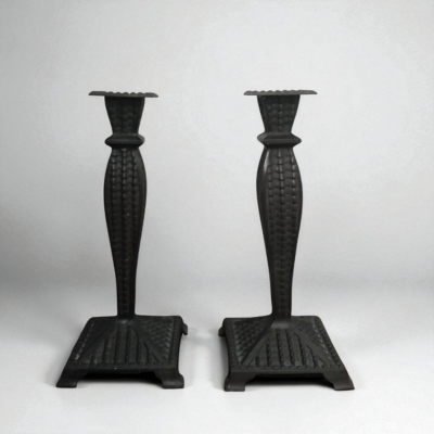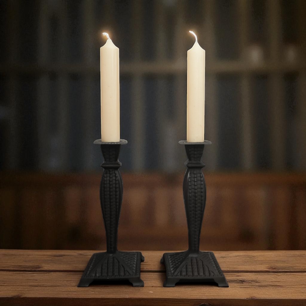 Add timeless elegance to your space with this pair of black iron candle holders.