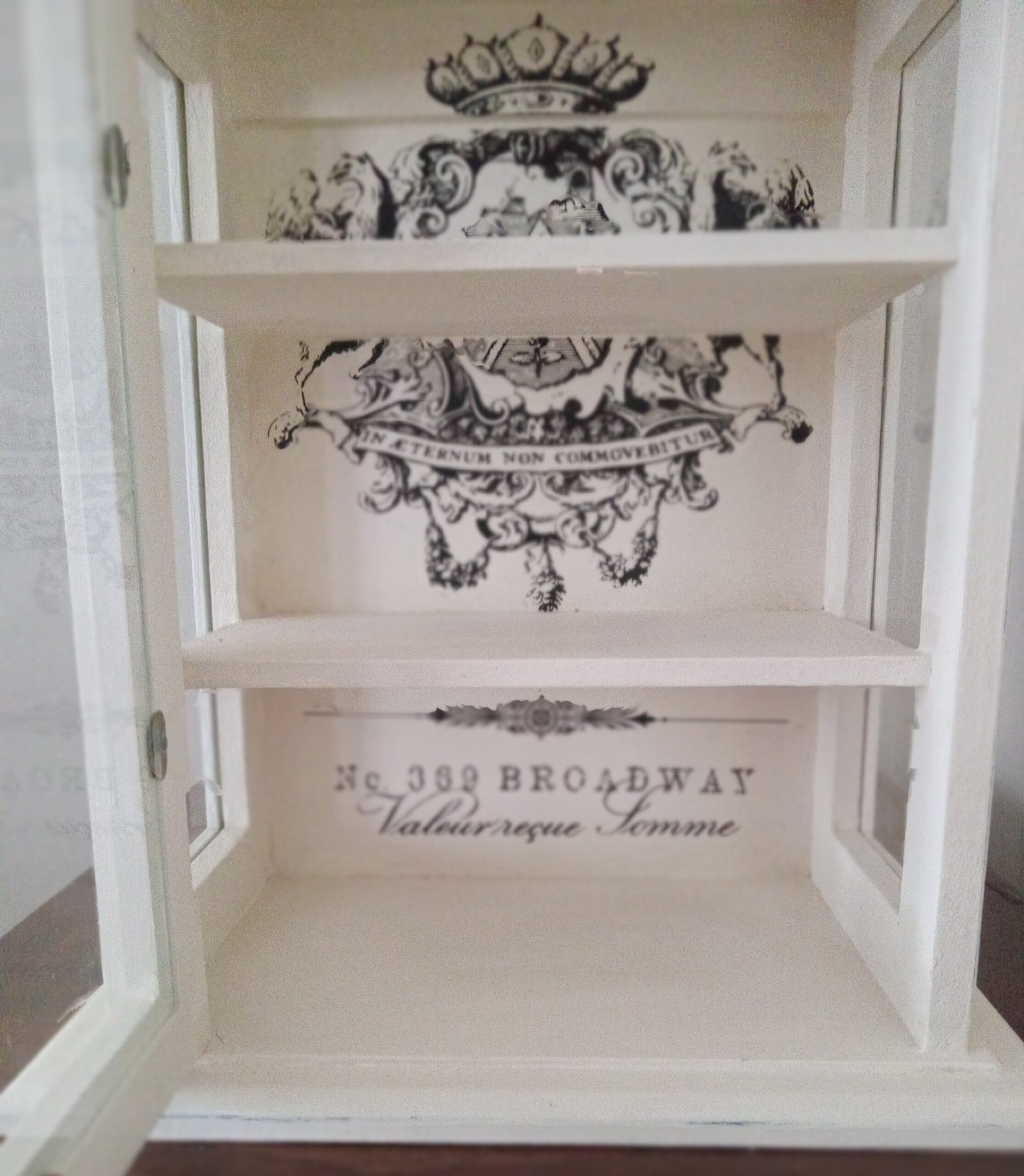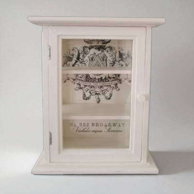 Display your treasures with elegance in this small cream curio shelf with two spacious tiers.
