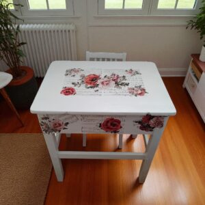 Bring charm and creativity into your child’s space with this vintage-inspired desk and chair set, beautifully upcycled in soft linen white and accented with whimsical floral sheet music patterns.