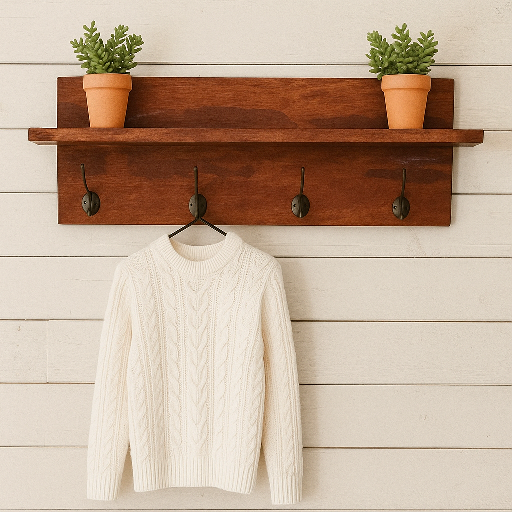 - Whether placed in your entryway, living room, or bedroom, this versatile wood shelf with hooks blends seamlessly into your décor.